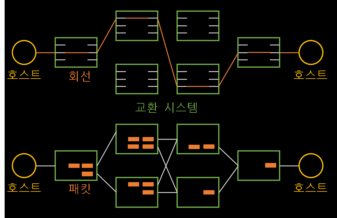 - 회선 교환 방식과는 패킷을 사용한다는 점에서 다름