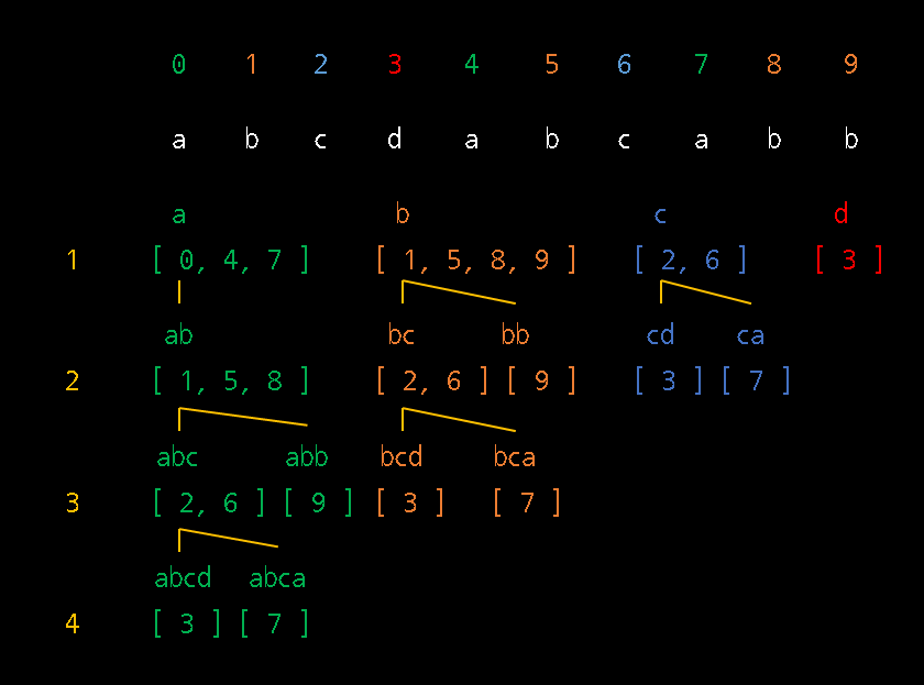 - prefix와 중복된 char 개수를 저장하는 KMP 알고리즘 활용
