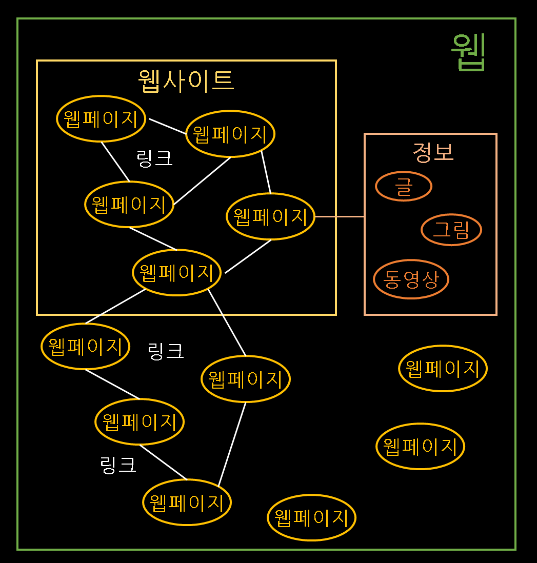 여기에 등장인물들을 그림으로 표현해보았다. 우리는 글, 그림, 영상 등을 통해 어떠한 정보를 얻을 수 있다. 웹페이지는 이러한 정보들을 담고 있다. 이 웹페이지들은 다른 페이지와 연결되어 있으며, 이렇게 웹페이지들이 모여있는 공간이 웹사이트인 것이다. 우리가 웹브라우저를 통해 보는 정보들이 하나의 웹 페이지(웹 문서)이고, 그 페이지에 걸려있는 링크를 통해 쉽게 다른 웹페이지로 이동하여 다른 정보들을 볼 수 있는 것이다.