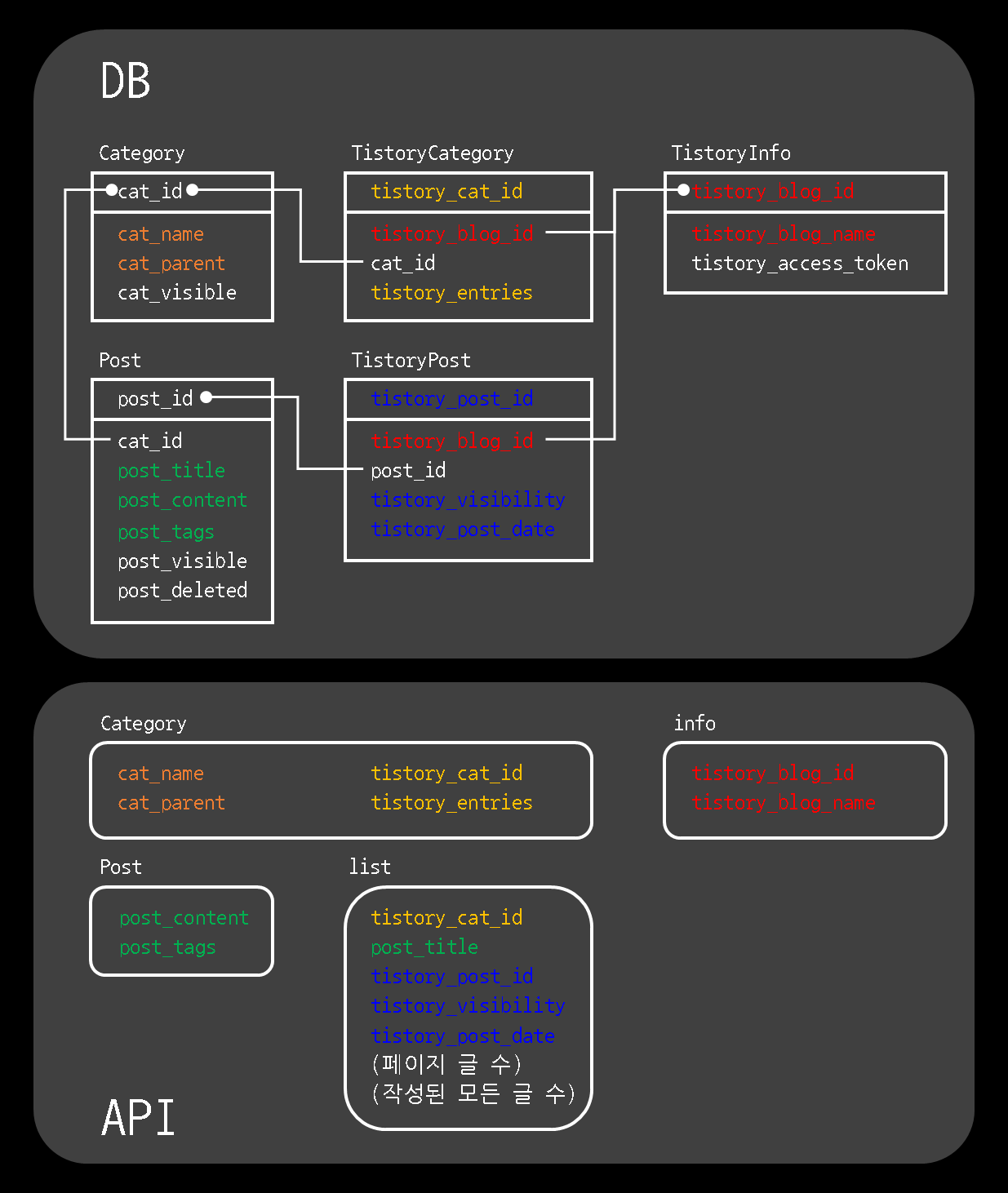 위 DB는 DB 테이블이고, 아래 API는 티스토리 API를 통해 이 테이블을 채울 수 있는 요소를 표현했다. 이전에 API로 받은 데이터 중 사용할 데이터만 따로 정리해두었다. 이 내용을 바탕으로 DB 생성 DDL과 API를 활용한 로직을 작성해야겠다.