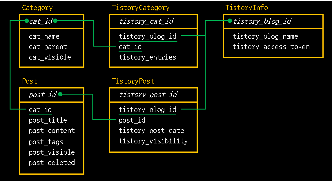 왼쪽 Category/Post가 블로그의 카테고리와 내용이 들어가는 테이블이다. 중간 TistoryCategory/TistoryPost는 Tistory에 관련된 내용을 따로 분리시켜놓은 테이블이다. 이렇게 Tistory를 분리시켜놓은 이유는, 혹시 다른 블로그를 사용하게되었을 때를 대비하기 위해서이다. 오른쪽 TistoryInfo도 혹시 다른 계정을 사용할 수 있기 때문에 계정정보도 분리시켜두었다.