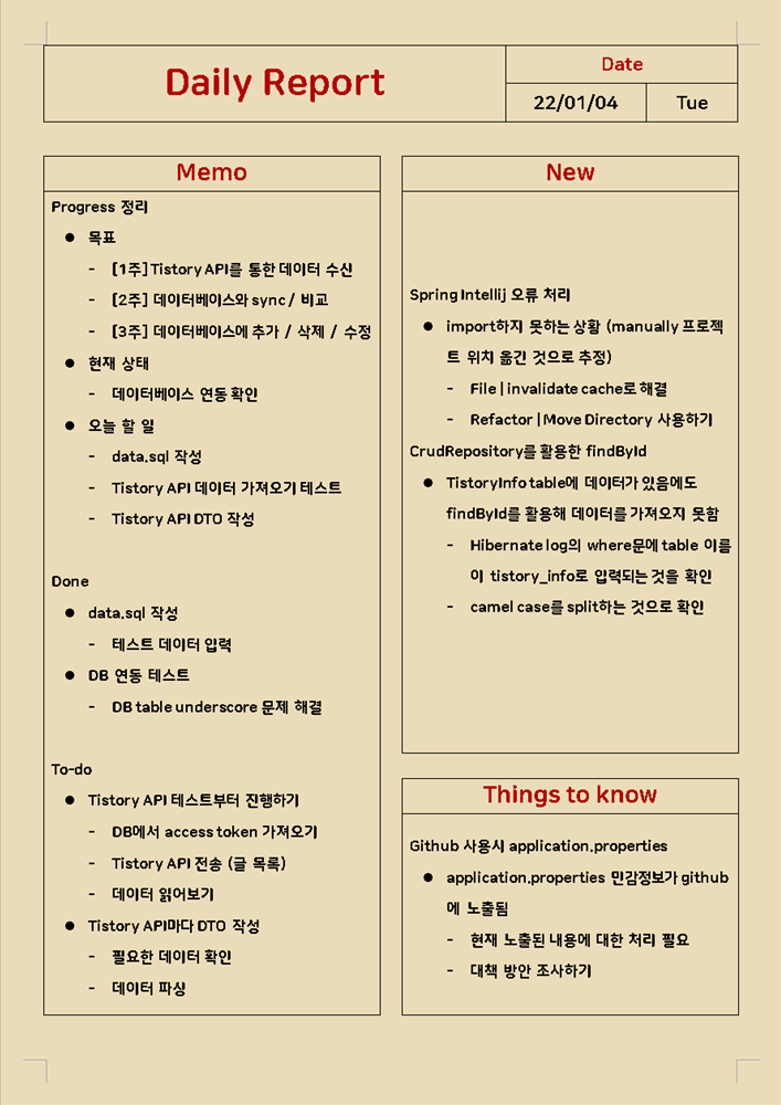 | [Daily Report] 22.01.05 - Tistory API 데이터 파싱 구현 (0) | 2022.01.06 |