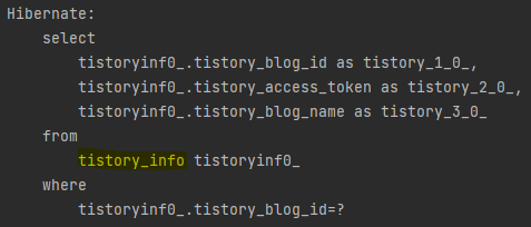 Hibernate 로그를 살펴보니, SQL문의 table 이름에 문제가 있다는 것을 확인했습니다. DB의 table 이름이 TistoryInfo인데, 로그에 따르면 tistory_info라는 table에서 데이터를 찾고 있었습니다.