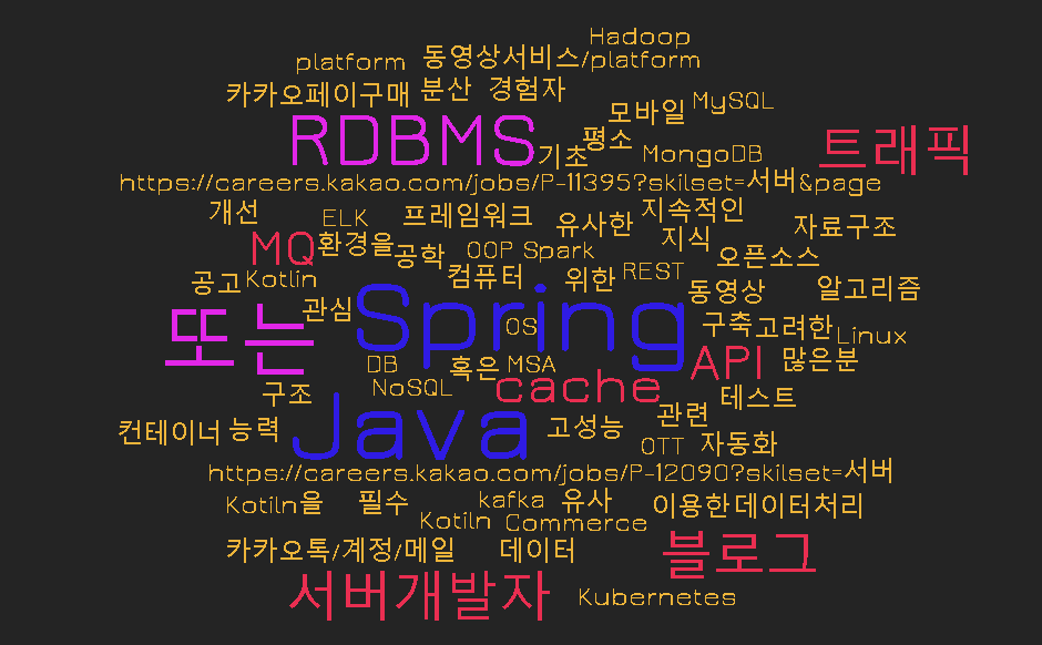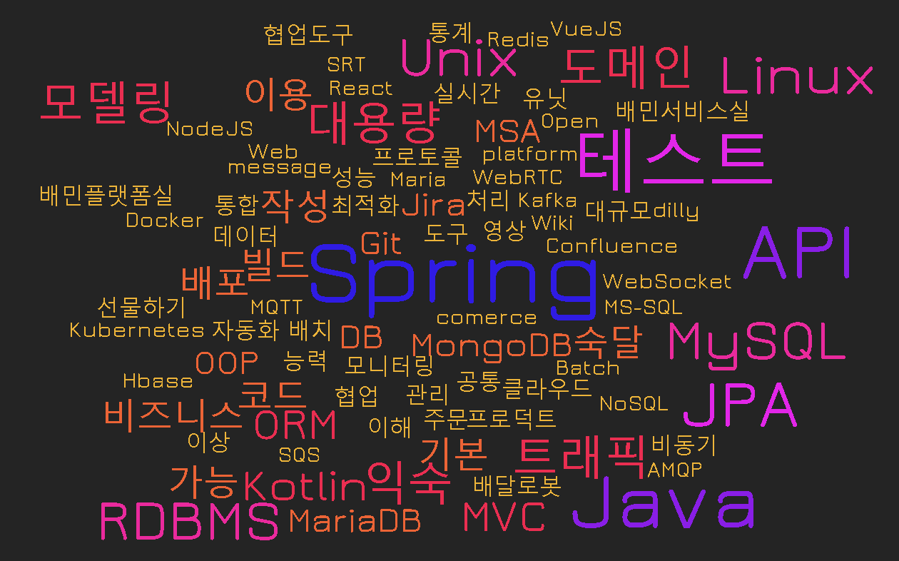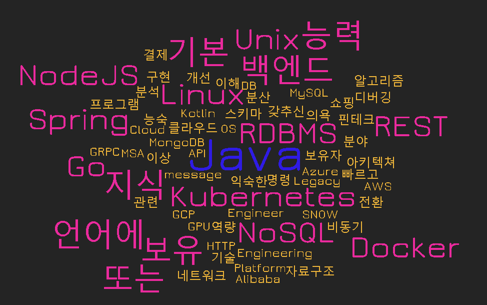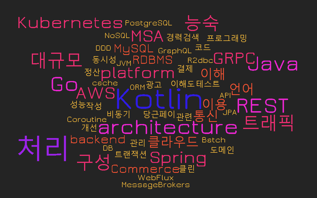 이를 통해서 내가 목표하는 백엔드 개발자에게 필요한 역량이 무엇인지 종합해볼 수 있었다. 내가 예상했던 사실은 Java와 Spring이 가장 큰 파이를 차지할 것 같았다. 그리고 예상치 못했던 것은 Kotlin이나 Go가 생각보다 많았고, Kubernetes가 많이 보인 사실이다. 위 키워드만 두고, 앞으로 백엔드 개발자가 되기 위해 무게를 두고 경험해보아야할 것들을 다음과 같이 정리할 수 있겠다.