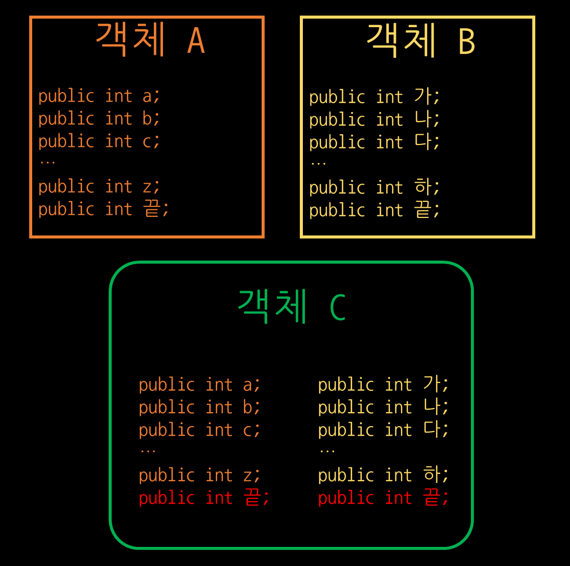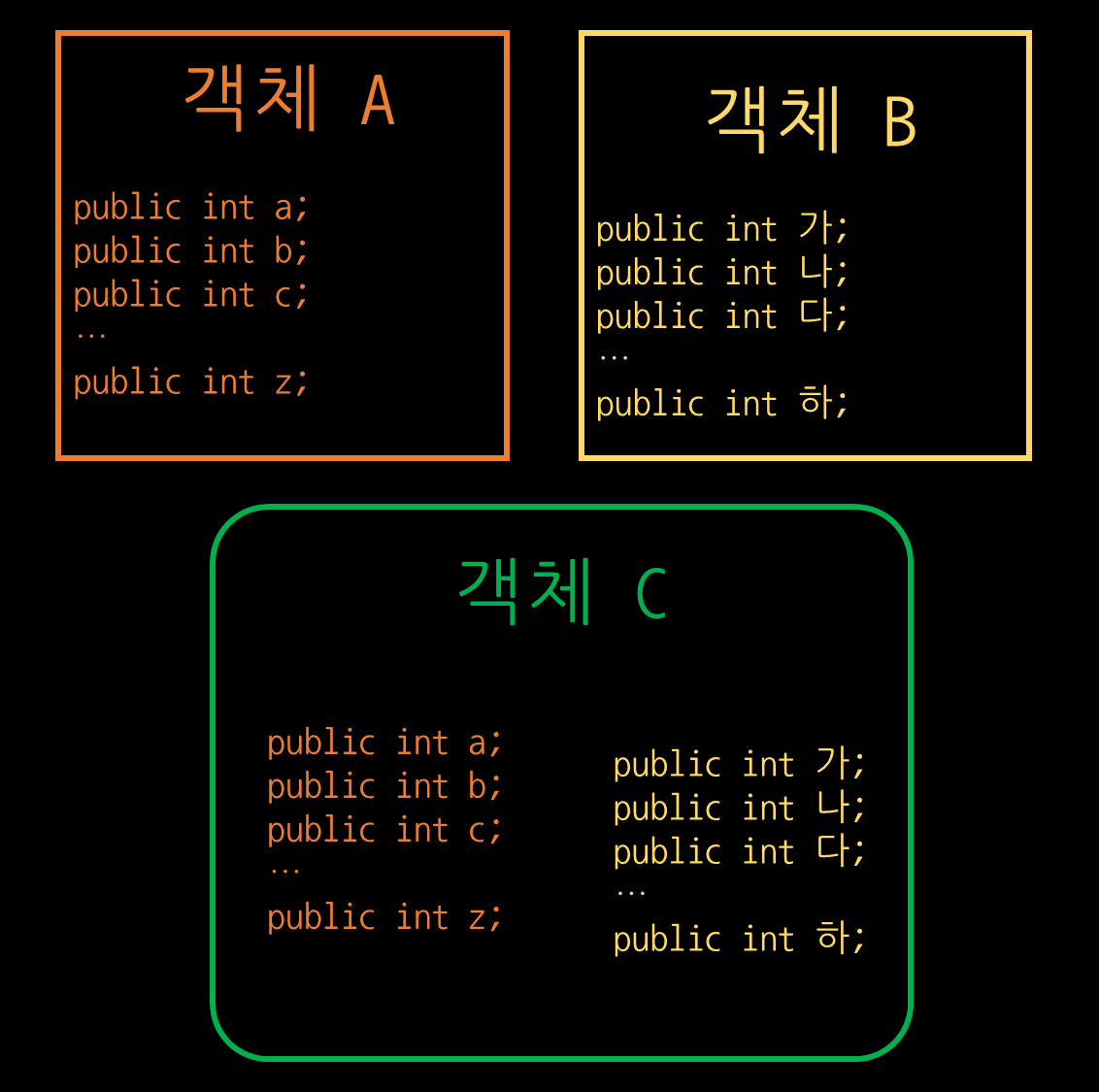 만약 다중상속이 된다면, 저는 A와 B를 모두 C가 상속하여 멤버변수를 다시 정의할 필요없이 관련 메서드만 작성하면 간단하게 C를 정의할 수 있습니다. 멤버가 많을수록 C를 정의하기 편하기도 하고, 중복된 이름의 변수가 줄어들기 때문에 더 선호하는 방식일 수 있습니다.