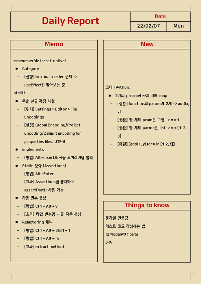 | [Daily Report] 22.02.03 - 2월 계획 정비 (0) | 2022.02.03 |