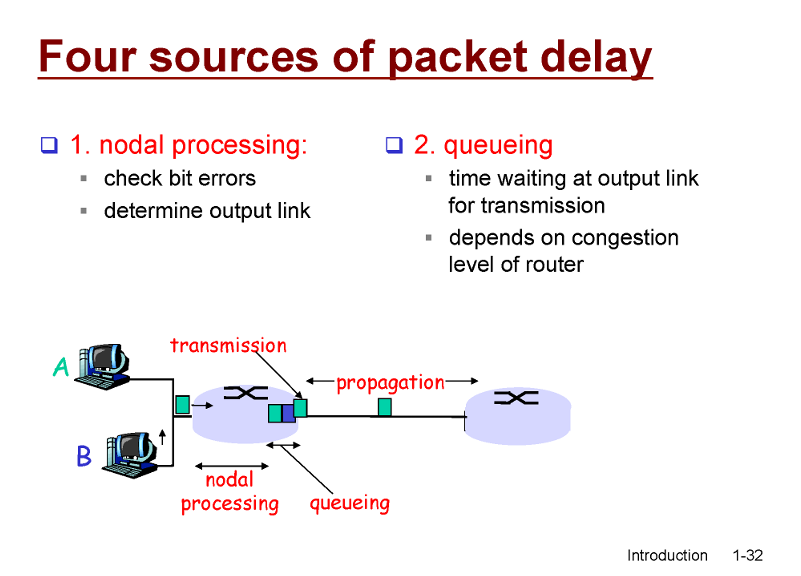 - packet이 라우터에 도달하면 패킷을 검사하여 소모되는 시간(올바른 패킷인지, 도착지는 어디인지 등등) - 2. queueing delay