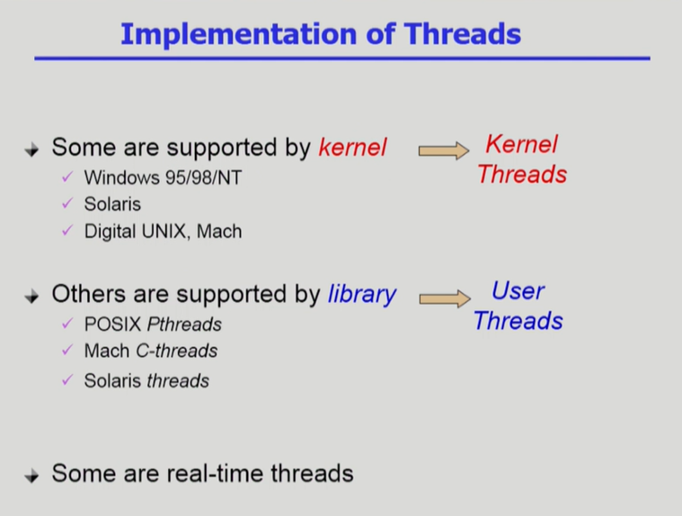 - 쓰레드가 여러 개 있다는 사실을 운영체제 커널이 알고 있음