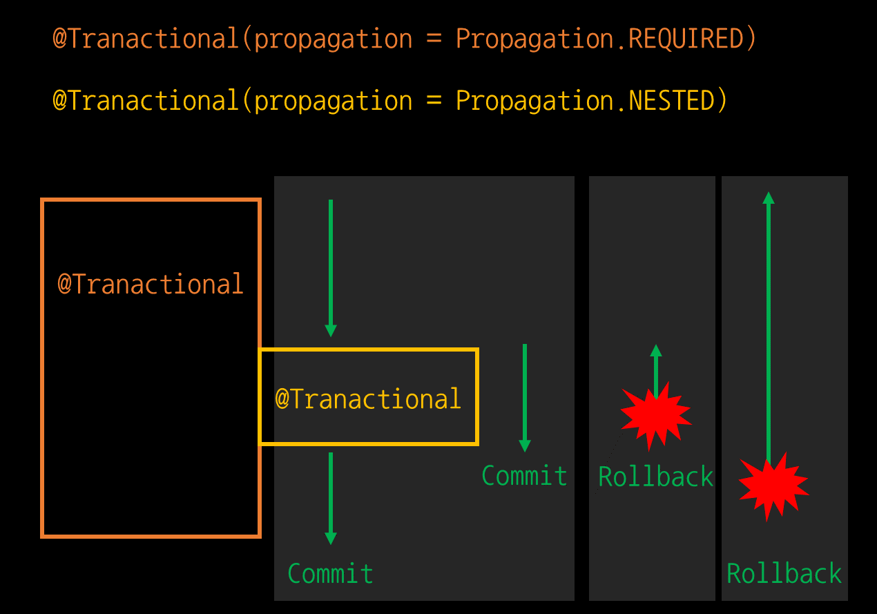 NESTED는 중첩된 트랜잭션으로, exception 위치에 따라 ROLLBACK의 정도가 달라집니다. SAVEPOINT와 같은 기능으로, 지정된 상태까지 ROLLBACK합니다.