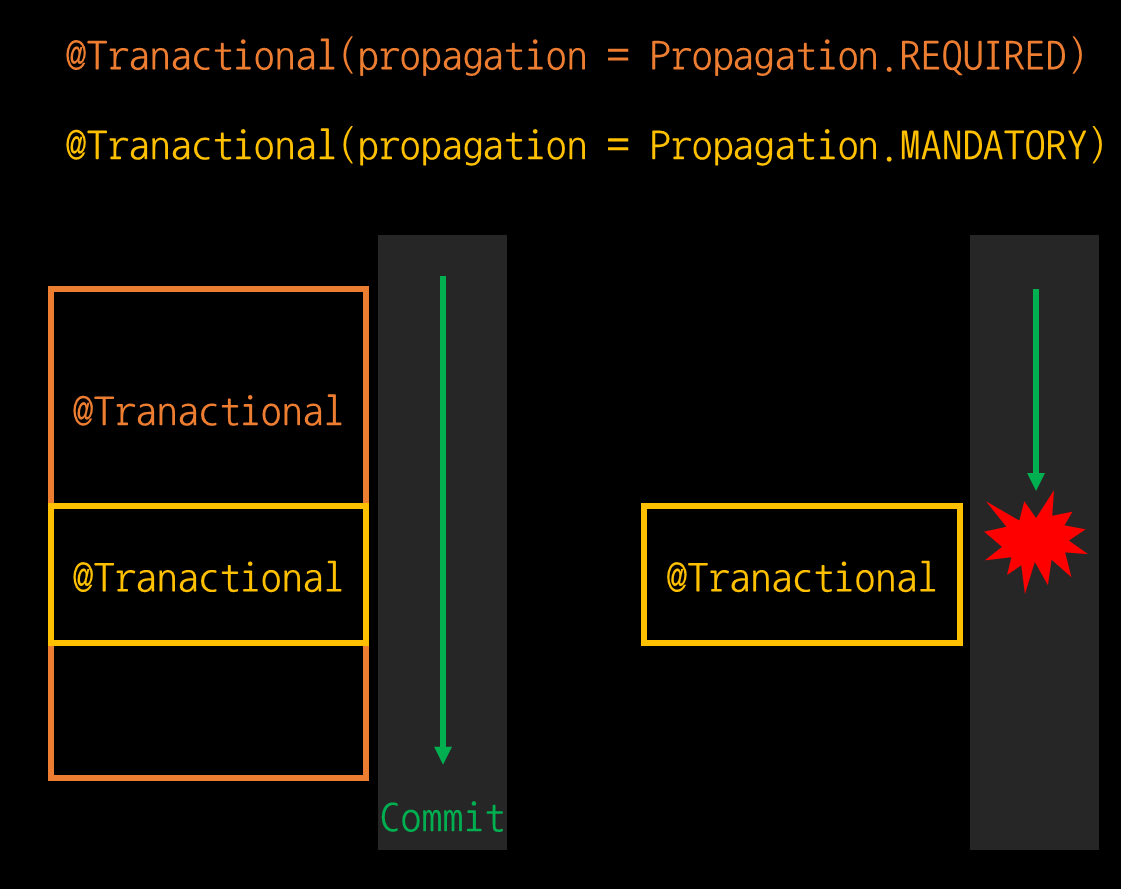 MANDATORY는 부모 트랜잭션을 필요로 합니다. 부모 트랜잭션이 없다면 exception이 발생합니다.