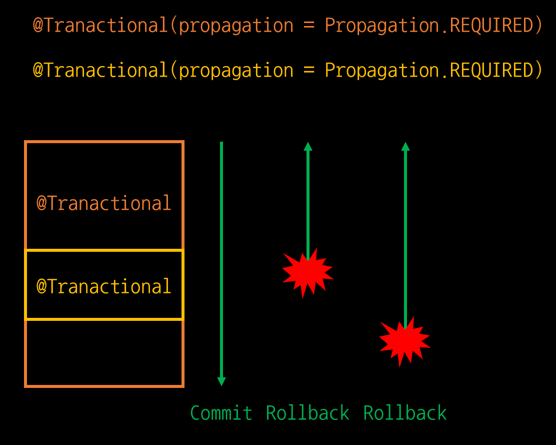 StackOverflow[6]에 의하면 @Transactional 메서드 호출시 aspect로 감싸 호출하기 때문에 해당 메서드는 public이며 Spring Bean이 호출해야합니다. 또한 Spring bean이 호출한다 해도, 호출하는 메서드에 @Transactional이 없으면 Rollback이 일어나지 않습니다. @Transactional 메서드를 직접 호출하도록 설계해야합니다.