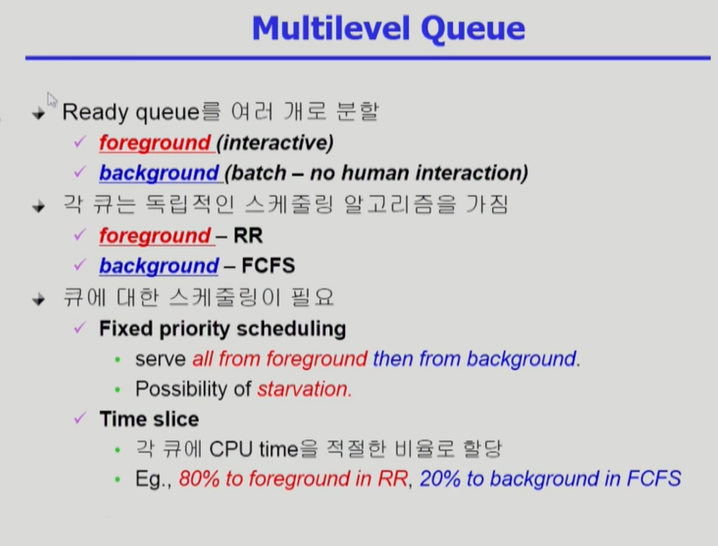 - 2. 시간 비율 : 우선순위가 높은 큐 80% / 우선순위가 낮은 큐 20% 시간 할당