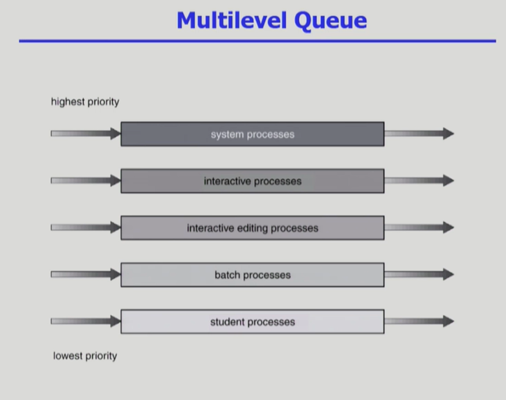 - 지금까지는 한 줄에서 기다리는 경우, multilevel queue는 여러 줄로 기다리는 경우