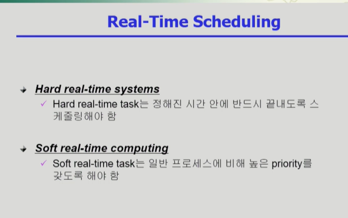 - Hard real-time system : 반드시 deadline 내에 끝나야 함