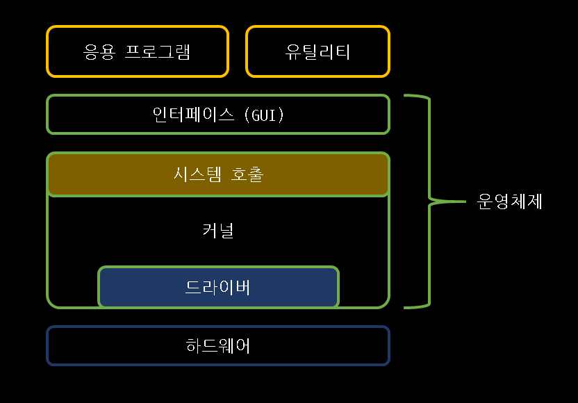 - CPU, 메모리, 마우스, 키보드 등 다양한 하드웨어를 복잡한 과정 없이 사용할 수 있도록 인터페이스 제공