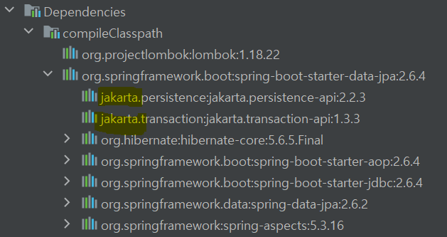 J2EE와 Spring을 비교한 글[7]에 따르면, 스프링은 J2EE를 위한 어플리케이션 개발 프레임워크이며, J2EE 개발을 쉽게 만들어준다고 합니다. 즉, JEE는 standard/specifiaction이지만, 스프링은 standard가 아닌 프레임워크입니다. 이 글[8]에 따르면, 스프링 또한 jakarta EE와의 호환성을 고려한 변경을 준비중인 듯 보이며, 현재 제가 만든 프로젝트(Spring boot 2.6.4)에서 사용하는 dependency에서는 javax가 아닌 jakarta를 볼 수 있습니다.