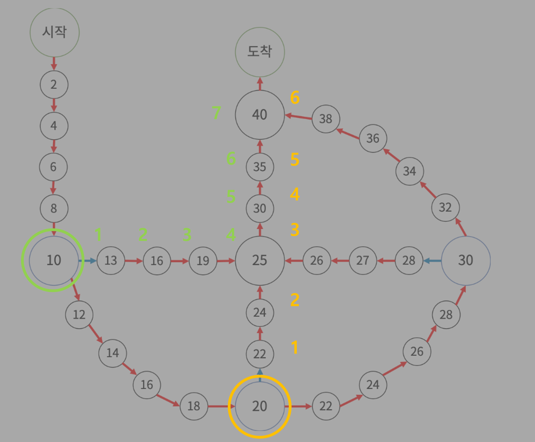 - ex) 10에서 파란색 방향으로 이동한 7칸 (1, 7) == 20에서 파란색으로 이동한 6칸 (2, 6)