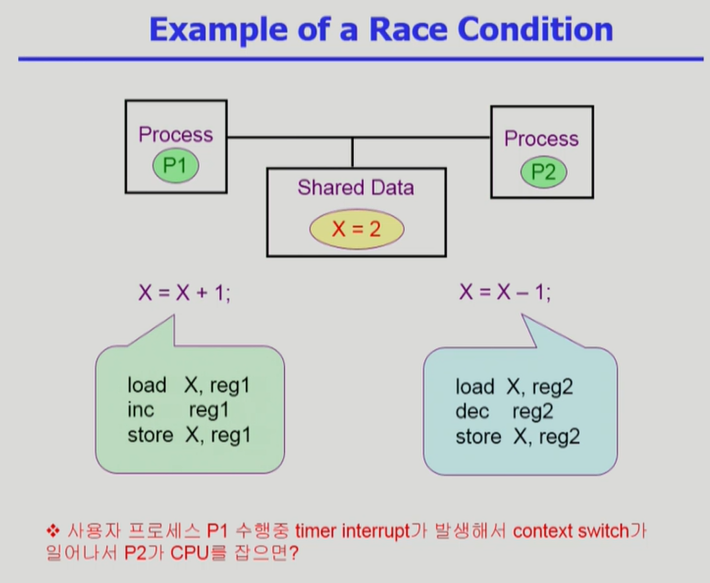 - 사용자 프로세스 P1이 수행중 timer interrupt로 context switching이 일어나 P2가 수행되는 것은 문제가 아님