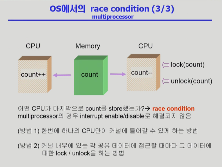 - 해결 방법1 : 커널모드로 하나의 CPU만 접근 가능 (커널 자체에 lock)