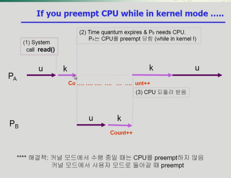 - 해결 방법 : 할당 시간이 끝났더라도, 커널모드에서 유저모드로 빠져나올 때 CPU를 빼앗음