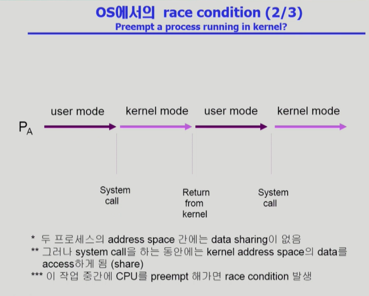 - race condition -> 대부분 커널모드에서 발생한다고 함