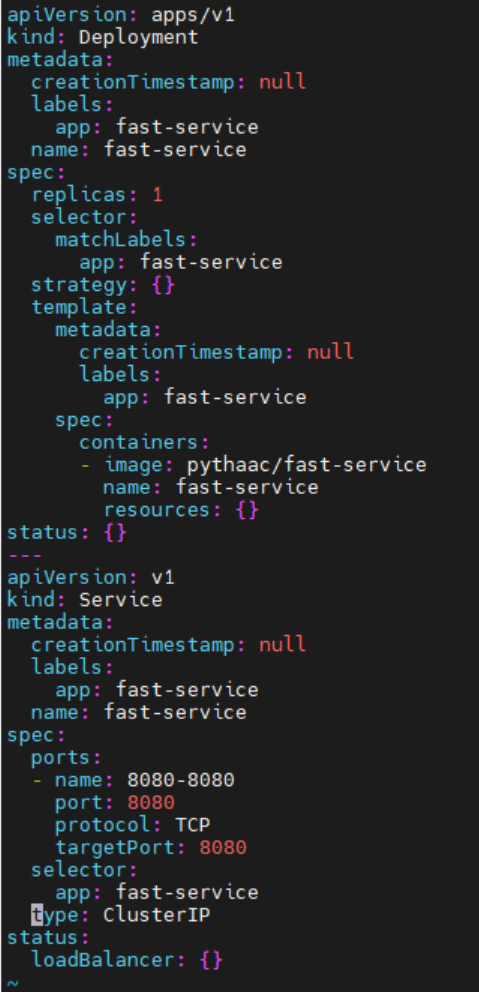 >> kubectl create deployment fast-service --image=pythaac/fast-service --dry-run=client -o=yaml > deployment.yaml